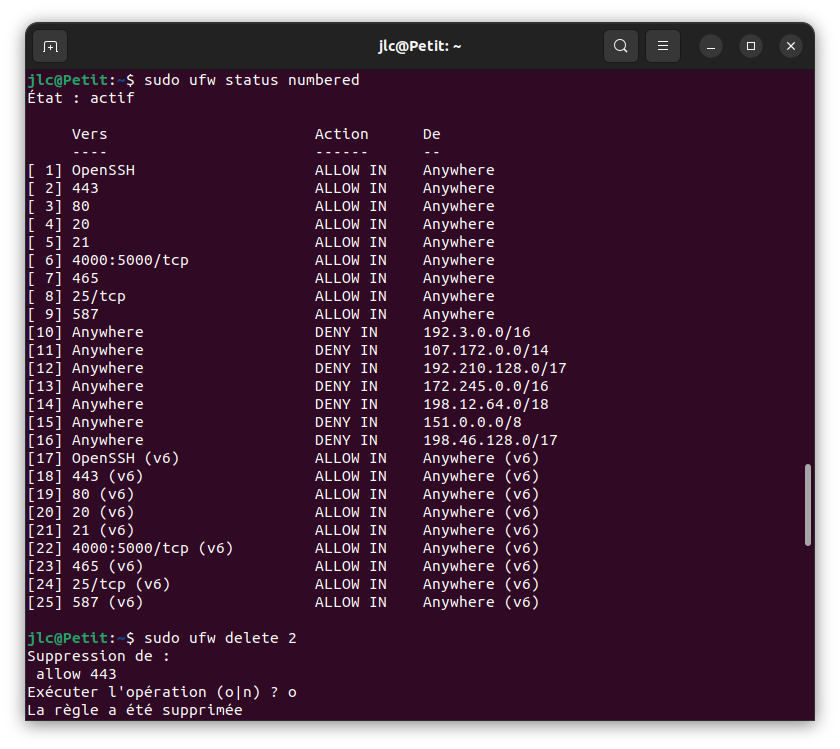 Afin de protéger mon serveur, j’ai activé le pare-feu à travers UFW en utilisant les règles suivantes :
